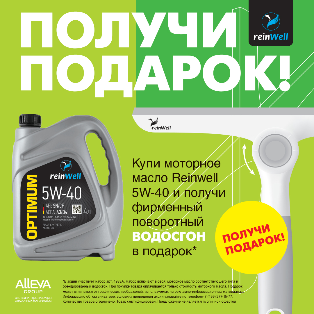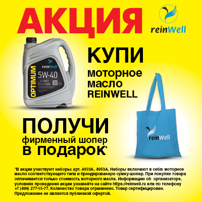 В период действия акции при покупке 4-х литровой канистры акционного моторного масла ReinWell  вы получаете в подарок фирменный складной водосгон.